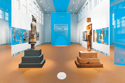 The preparatory work for the exhibition started in March 2021. To highlight the theme of “a dialogue between sculptures,” the Greek side proposed that the sculpture of a young Greek soldier named Kroisos Kouros should be displayed alongside a Chinese terracotta warrior figure. The final outcome is a virtual scene in which the two figures are seen standing face-to-face in an exhibition area inside the National Archaeological Museum of Greece.
