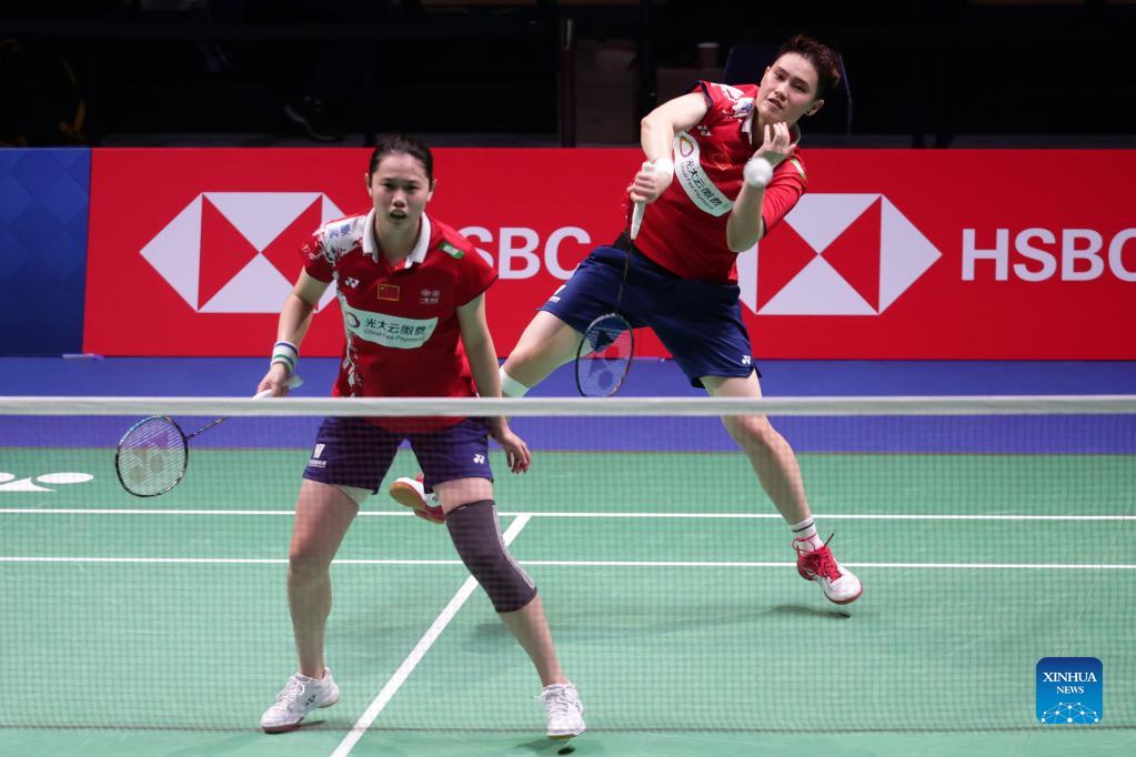 China's Li Wenmei (R)/Zheng Yu compete against India's Ashwini Ponnappa/Reddy N. Sikki in their women's doubles competition during the group A match between China and India at Badminton Surdiman Cup 2021 in Vantaa, Finland, Sept. 27, 2021. (Photo by Matti Matikainen/Xinhua)