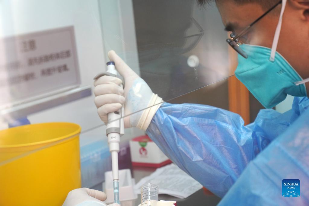 A staff member prepares reagent for nucleic acid testing at a PCR (polymerase chain reaction) lab in Bayan County, Harbin of northeast China's Heilongjiang Province, Sept. 27, 2021. The province on Sunday reported 11 new locally transmitted confirmed COVID-19 cases and three new local asymptomatic carriers. (Xinhua/Wang Jianwei)