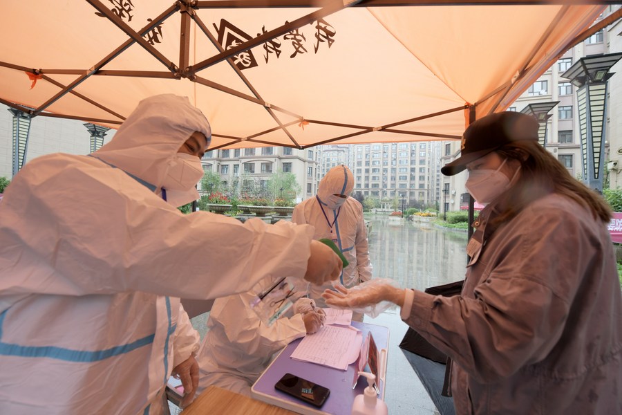 A staff member disinfects a resident's hands at a residential area in Bayan County, Harbin of northeast China's Heilongjiang Province, Sept. 27, 2021. (Xinhua/Wang Jianwei)