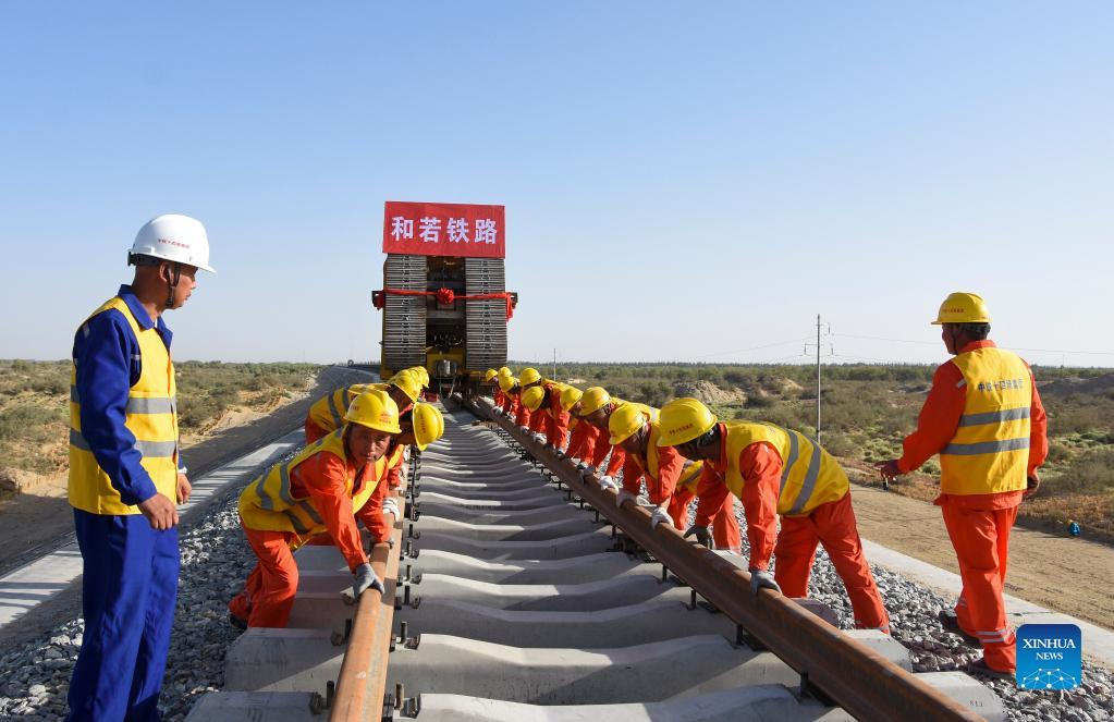 Workers prepare for the track-laying work for the Hotan-Ruoqiang Railway in northwest China's Xinjiang Uygur Autonomous Region, Sept. 27, 2021. The track-laying work for the Hotan-Ruoqiang Railway, the final section of the Taklimakan Desert railway loop line, was completed on Monday morning in Xinjiang's Minfeng County. Construction on the Hotan-Ruoqiang Railway started in December 2018. As a key national railway project extending over 825 km, it links up Hotan City in Hotan Prefecture with Ruoqiang County in Bayingolin Mongolian Autonomous Prefecture. The Hotan-Ruoqiang Railway is expected to open in June 2022. (Xinhua/Gu Yu)