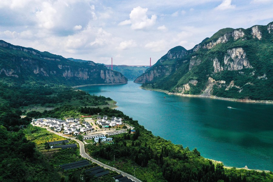 Aerial photo taken on July 24, 2021 shows a view of a relocation site for poverty alleviation at Huawu Village in Xinren Miao Township, Qianxi City, southwest China's Guizhou Province. (Xinhua/Yang Wenbin)