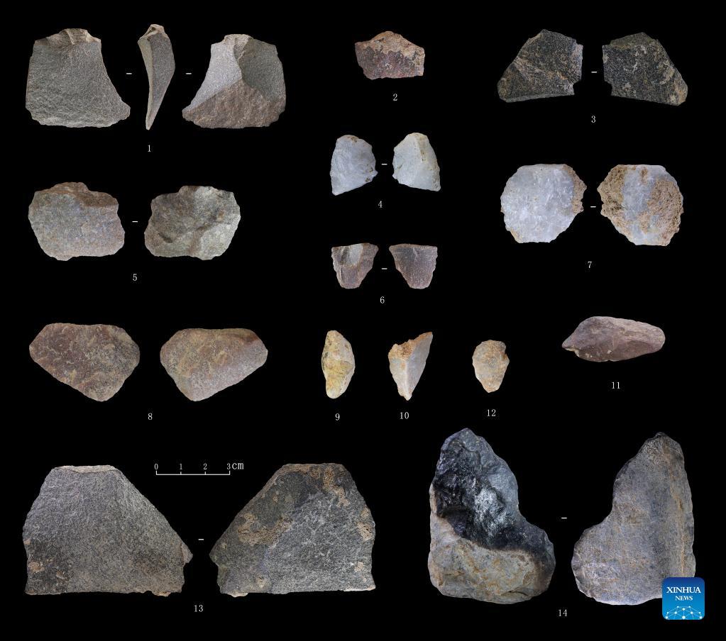 Photo shows stone tools unearthed from a cave site in Lushan County, central China's Henan Province. A human skull fossil dating back 32,000 years was found in a cave site in Henan, local archaeological authorities said on Sept. 27, 2021. The cave site is located in Guanyinsi Township, Lushan County. Earlier paleolithic archaeological research in the area has uncovered human fossils, animal fossils and stone tools. (Henan Provincial Institute of Cultural Heritage and Archaeology/Handout via Xinhua)