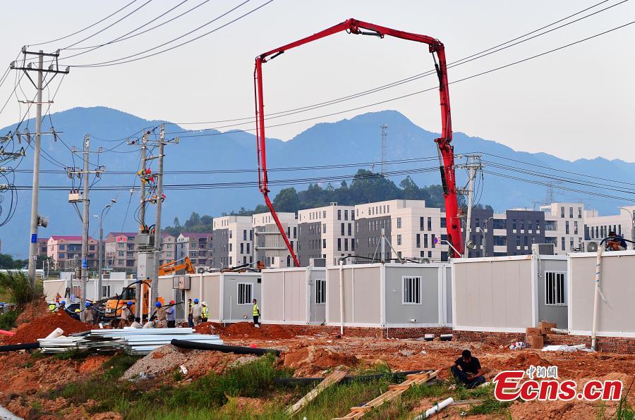 An isolation center with 1,000 temporary quarantine rooms is under construction on a 24/7 basis at Ruifeng Industrial Park in Xianyou County, Putian City, east China’s Fujian Province, Sept. 27, 2021. (China News Service/Zhang Bin)