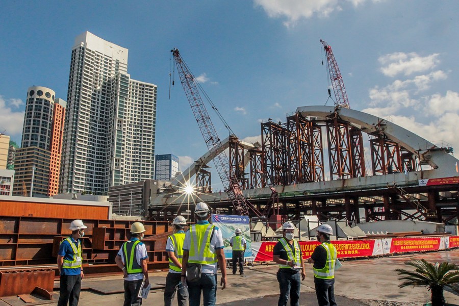 Construction workers and engineers are seen at the building site of the China-funded Binondo-Intramuros Bridge in Manila, the Philippines, Feb. 4, 2021. (Xinhua/Rouelle Umali)