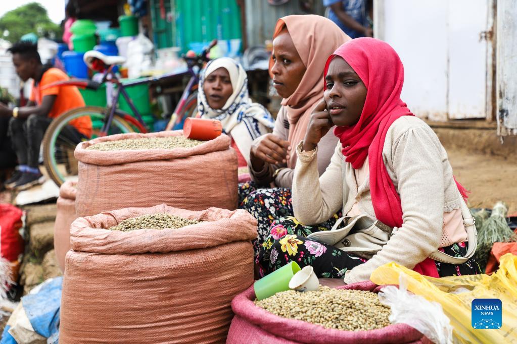 Coffee farmers sell coffee beans at a market in Gomma of Oromia, Ethiopia, on Sept. 22, 2021. Ethiopia, known as the origin of Arabica coffee, is recognized worldwide for its rich coffee quality and flavor, which ranges from winy to fruity and chocolate, making the country's coffee varieties on demand across the globe. The growing popularity of Ethiopian coffee in China reflects the huge potential of African products in Chinese market. (Photo by Michael Tewelde/Xinhua)
