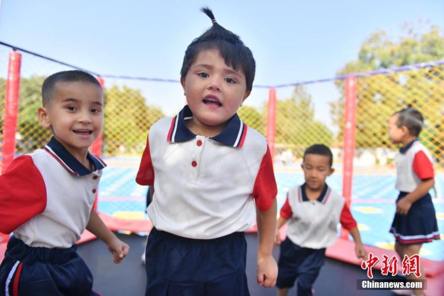 Children have fun on the playground in Kumu village's kindergarten, Hotan County, China's Xinjiang Uygur Autonomous Region, Sept. 27, 2021. (China News Service/Tian Yuhao)