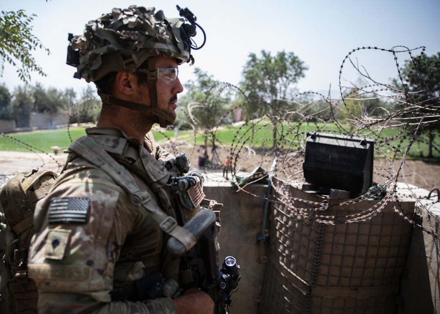 A paratrooper conducts security at Hamid Karzai International Airport in Kabul, Afghanistan, on Aug. 29, 2021. (U.S. Army Photo by Master Sgt. Alexander Burnett/Handout via Xinhua)