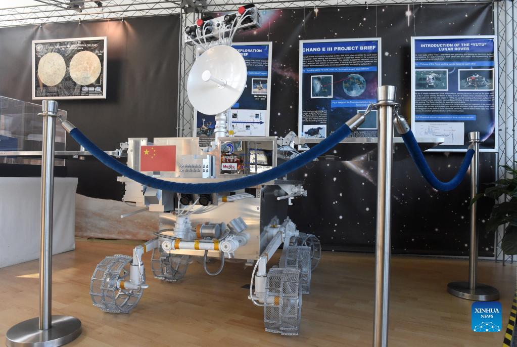 Photo taken on Sept. 28, 2021 shows a model of China's lunar rover Yutu at the Vienna International Center in Vienna, Austria. Models of space projects from across the world including China's space station and lunar rover Yutu are displayed at the Vienna International Center. (Xinhua/Guo Chen)