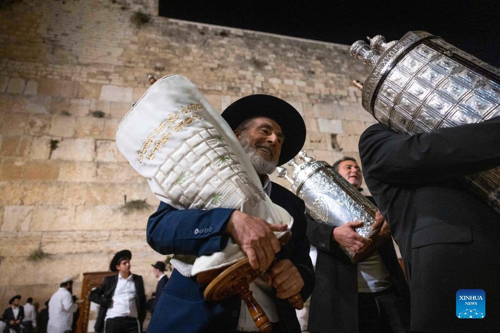 Jewish men carry Torah scrolls during Simchat Torah celebrations at the Western Wall in Jerusalem's Old City, on Sept. 28, 2021. (JINI via Xinhua)