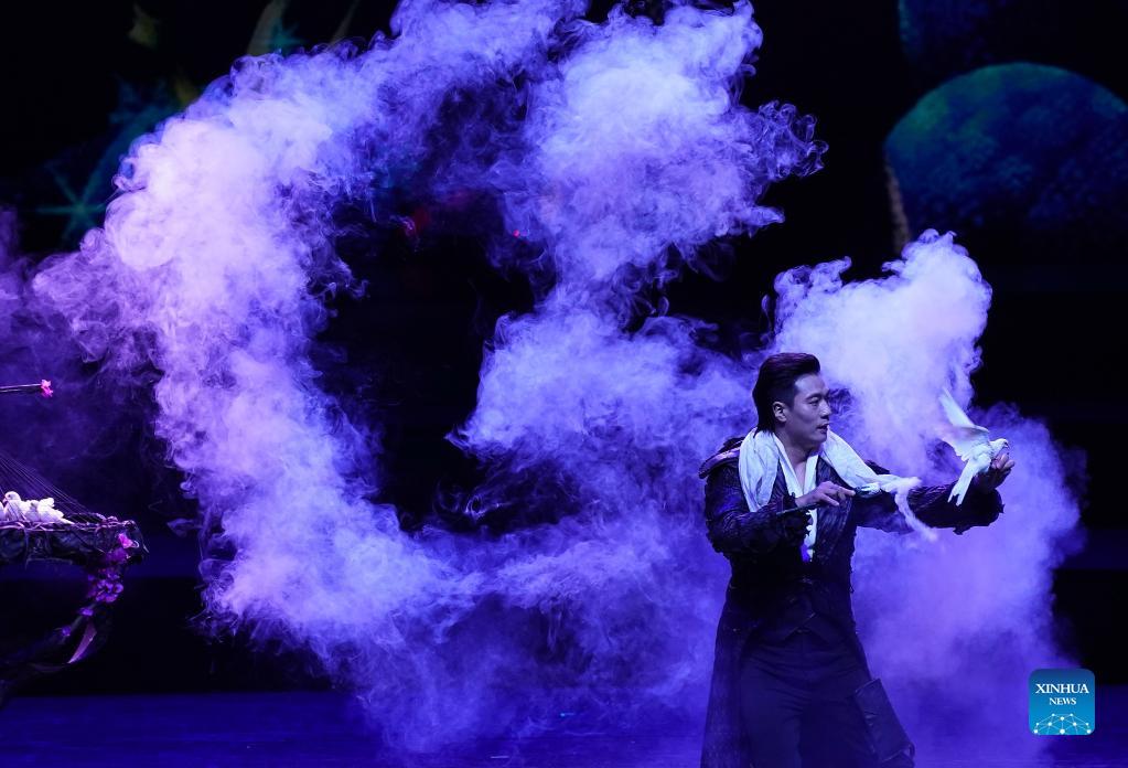 An acrobat performs at the opening ceremony of the 18th China Wuqiao International Circus Festival in Shijiazhuang, north China's Hebei Province, Sept. 28, 2021. The 18th China Wuqiao International Circus Festival kicked off Tuesday in Shijiazhuang. The three-day event will be held both online and offline in Shijiazhuang and Cangzhou of Hebei Province. (Xinhua/Mu Yu)