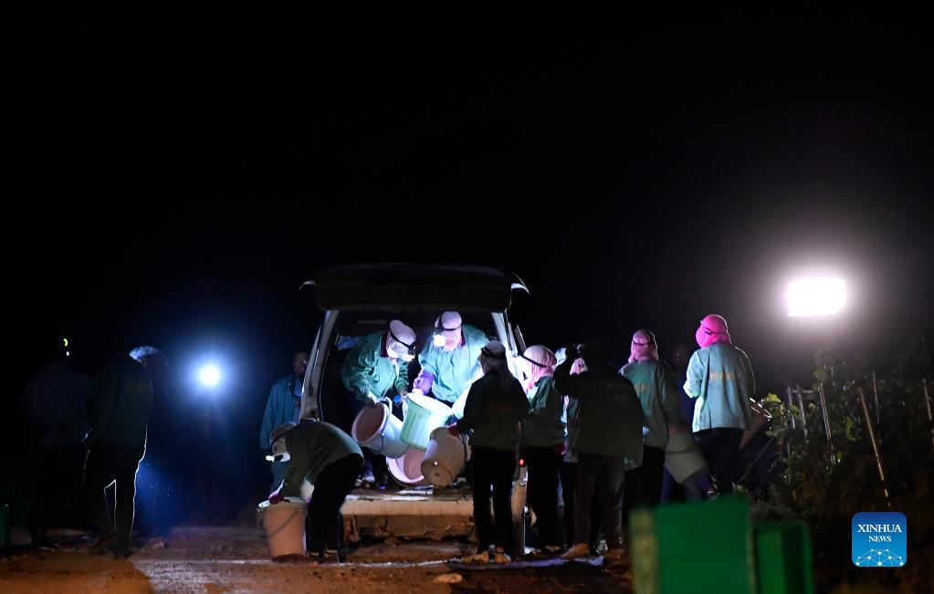 Workers prepare to pick grapes in Minning Township of Yongning County, northwest China's Ningxia Hui Autonomous Region, Sept. 24, 2021. At around 3 a.m., the foothills of Helan Mountain in Ningxia are illuminated by headlamps worn by farmers ready to pick grapes in the vineyards here. The low temperature at night helps retain the aroma and flavor of grapes, and therefore ensures the quality of wine. In the past, the foothills of Helan Mountain were strewn with barren lands. But now, thanks to abundant sunshine, adequate irrigation and favorable climate, the area has become a "golden zone" for the growth of wine grapes. The wine and grape industry has pillared Ningxia's sustainable economic development, providing more than 120,000 jobs. (Xinhua/Yang Zhisen)