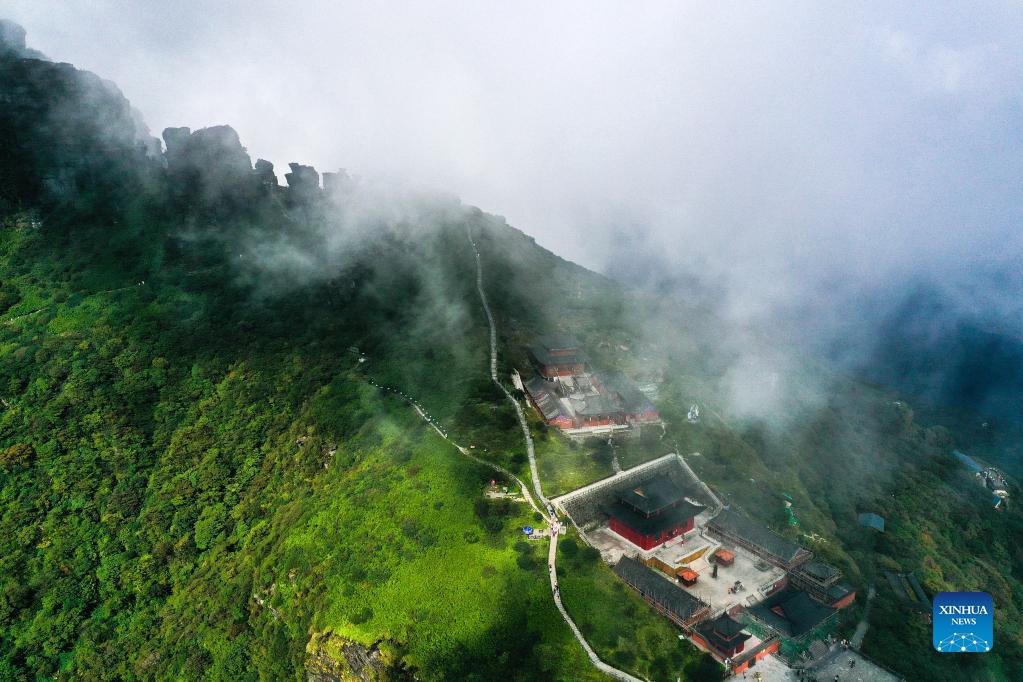 Aerial photo taken on Sept. 27, 2021 shows a view of Mount Fanjing in Tongren City, southwest China's Guizhou Province. Boasting rich natural resources and high vegetation coverage, Mount Fanjing was listed as a UNESCO World Natural Heritage Site in 2018. (Xinhua/Yang Wenbin)