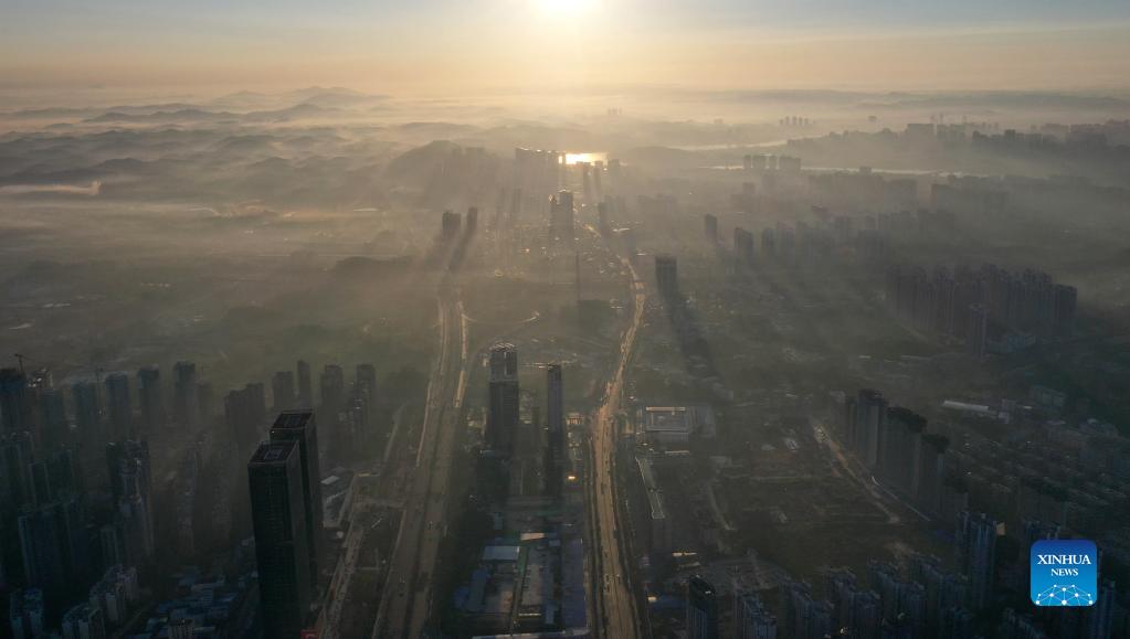 Aerial photo taken on Sept. 27, 2021 shows an early morning view of Nanning, capital of south China's Guangxi Zhuang Autonomous Region. (Xinhua/Huang Xiaobang)