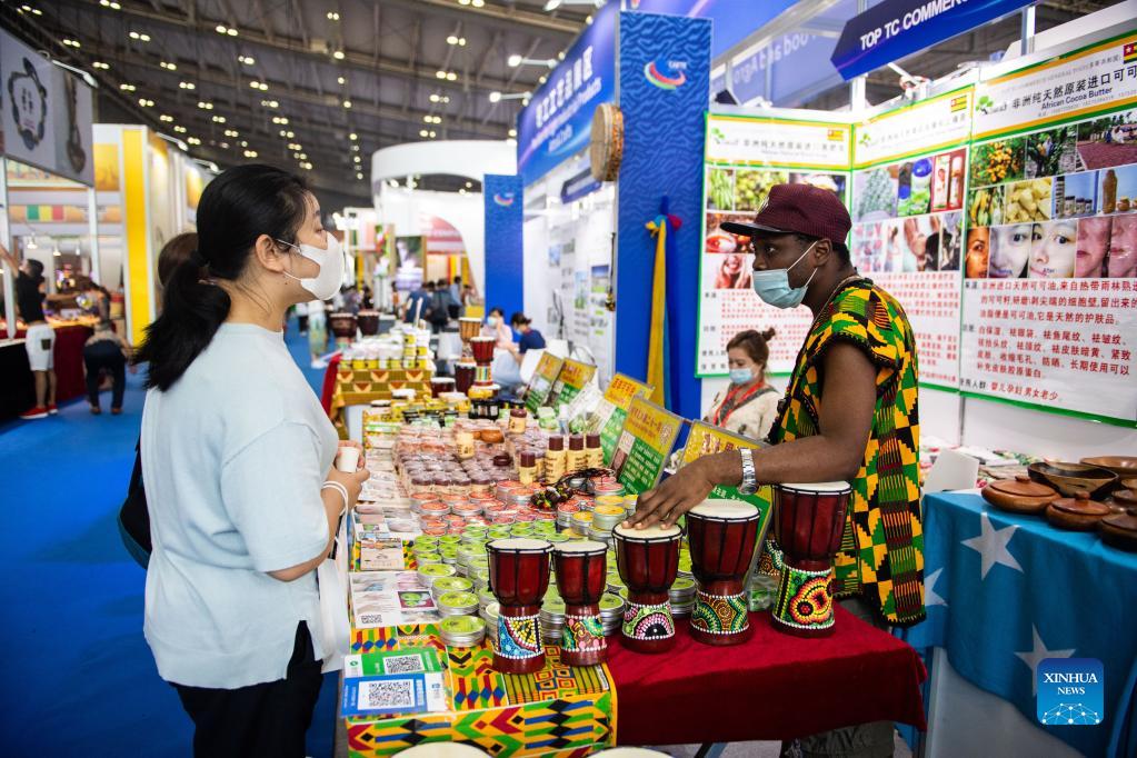 A visitor buys skincare products during the Second China-Africa Economic and Trade Expo in Changsha, capital of central China's Hunan Province, Sept. 28, 2021. The Second China-Africa Economic and Trade Expo opened to the public on Sunday. The four-day event, held both online and offline, has attracted nearly 900 enterprises from about 40 African countries and China, according to the organizers. Since its launch in 2019, the expo has served as a major platform for strengthening economic and trade cooperation between China and African countries. (Xinhua/Chen Sihan)