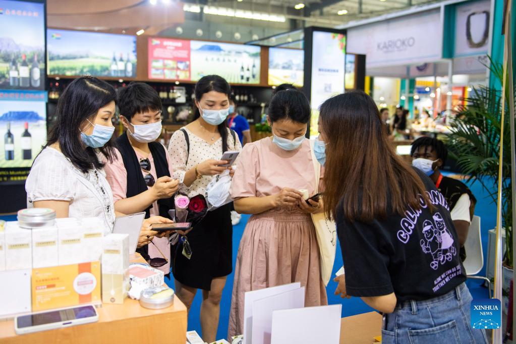 Visitors buy skincare products during the Second China-Africa Economic and Trade Expo in Changsha, capital of central China's Hunan Province, Sept. 28, 2021. The Second China-Africa Economic and Trade Expo opened to the public on Sunday. The four-day event, held both online and offline, has attracted nearly 900 enterprises from about 40 African countries and China, according to the organizers. Since its launch in 2019, the expo has served as a major platform for strengthening economic and trade cooperation between China and African countries. (Xinhua/Chen Sihan)