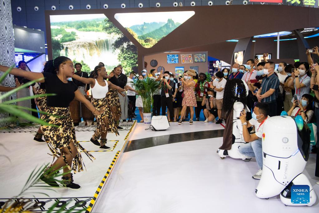 Visitors watch a performance at the exhibition area of Rwanda during the Second China-Africa Economic and Trade Expo in Changsha, capital of central China's Hunan Province, Sept. 28, 2021. The Second China-Africa Economic and Trade Expo opened to the public on Sunday. The four-day event, held both online and offline, has attracted nearly 900 enterprises from about 40 African countries and China, according to the organizers. Since its launch in 2019, the expo has served as a major platform for strengthening economic and trade cooperation between China and African countries. (Xinhua/Chen Sihan)