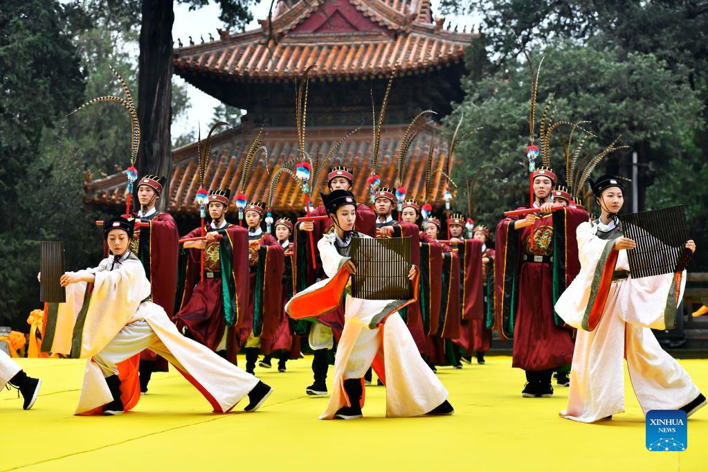 A ceremony marking the 2,572nd anniversary of the birth of ancient Chinese sage and educator Confucius is held at Confucius Temple in Qufu, east China's Shandong Province, Sept. 28, 2021. Born near the present-day town of Qufu, Confucius (551-479 B.C.) founded a school of thought that influenced later generations and became known as Confucianism. (Xinhua/Guo Xulei)