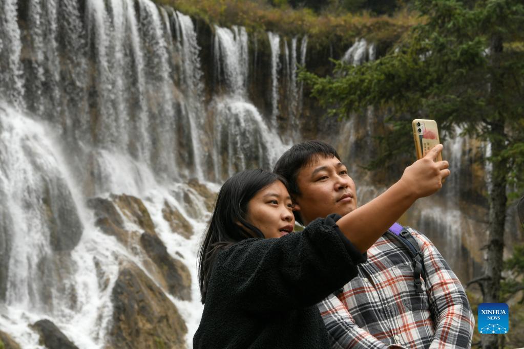 Tourists take a selfie in front of a waterfall at the Jiuzhaigou scenic spot in Jiuzhaigou County, southwest China's Sichuan Province, Sept. 27, 2021. Jiuzhaigou, a famous scenic spot in Sichuan Province, fully reopened to visitors on Tuesday. On Aug. 8, 2017, a 7.0-magnitude quake forced the closure of the Jiuzhaigou National Park, a UNESCO World Heritage site famous for its spectacular waterfalls, lush forests, and serene plateau lakes. More than 270,000 trees have been planted over the past three years, and 172 hectares of ecological habitat repaired and restored in Jiuzhaigou. The damaged mountains and vegetation have also rapidly recovered. The ecosystem was effectively restored. (Xinhua/Tang Wenhao)