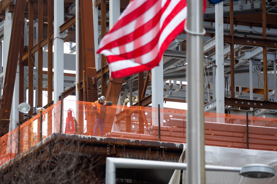 A construction worker works at the Ronald O. Perelman Performing Arts Center at the World Trade Center construction site, in New York, United States, Jan. 8, 2021. (Photo by Michael Nagle/Xinhua)