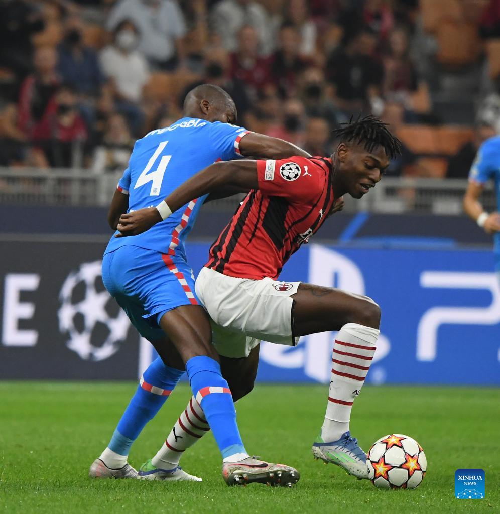 Atletico de Madrid's Geoffrey Kondogbia (L) vies with AC Milan's Rafael Leao during the UEFA Champions League Group B match between AC Milan and Atletico de Madrid in Milan, Italy, Sept. 28, 2021. (Photo by Alberto Lingria/Xinhua)