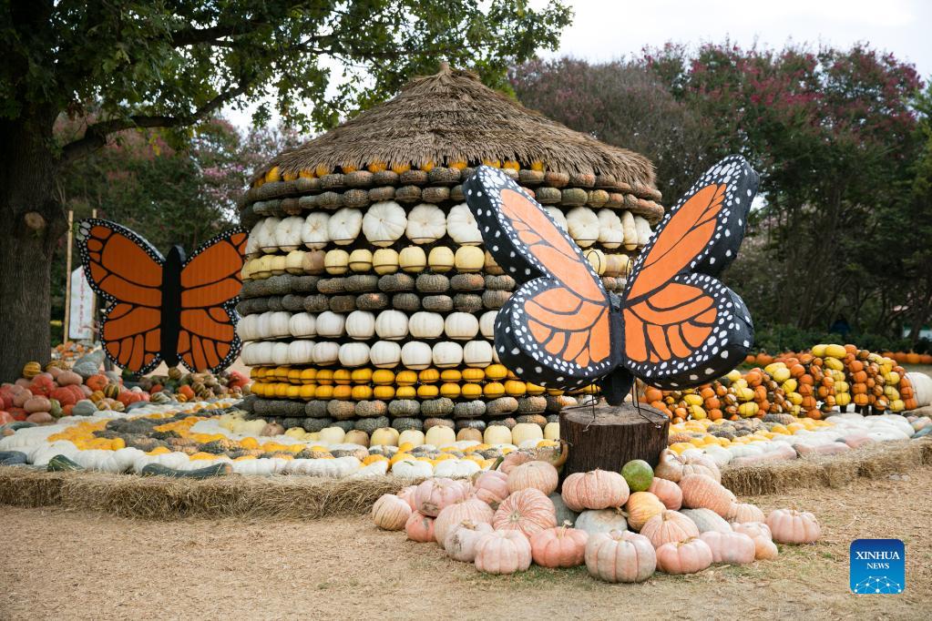 Photo taken on Sept. 28, 2021 shows a pumpkin house at Arboretum's Pumpkin Village in Dallas, Texas, the United States. The Pumpkin Village returns to Dallas Arboretum with more than 90,000 pumpkins, gourds and squash. This year's theme is "Bugtopia". (Photo by Tian Dan/Xinhua)
