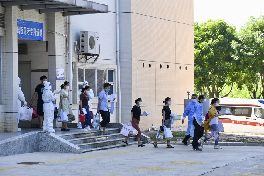 Patients recovered from COVID-19 leave the hospital in Xiamen, east China's Fujian Province, on Sept. 25, 2021. (Xinhua/Jiang Kehong)