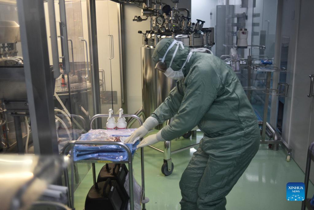 A staff member works at a joint venture between China's biopharmaceutical firm Sinovac Biotech and Algeria's pharmaceutical group Saidal in the province of Constantine, Algeria, on Sept. 29, 2021. Algeria on Wednesday started manufacturing the Sinovac COVID-19 vaccines at a joint venture with China, which is located in the eastern province of Constantine. (Xinhua)