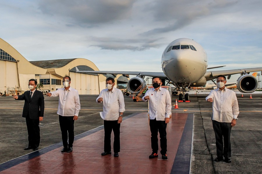 Philippine President Rodrigo Duterte (C) stands with Chinese Ambassador to the Philippines Huang Xilian (1st L) and other officials upon the arrival of government-purchased Sinovac COVID-19 vaccines in Manila, the Philippines, on March 29, 2021.(Xinhua/Rouelle Umali)