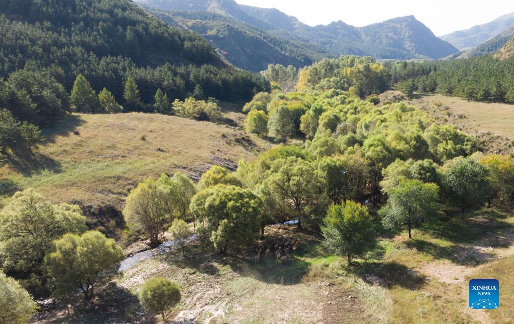 Aerial photo taken on Sept. 29, 2021 shows a herd of released elks running at the Daqingshan Nature Reserve in Hohhot, north China's Inner Mongolia Autonomous Region. A total of 27 elks (or milu) were released to the Daqingshan Nature Reserve on Wednesday. Those elks will be monitored through tracking necklaces based on the Beidou Navigation Satellite System. (Xinhua/Darhan)