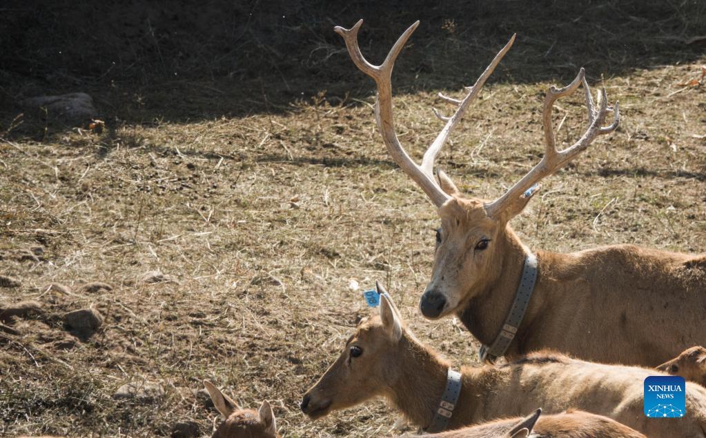 Photo taken on Sept. 29, 2021 shows elks waiting to be released at the Daqingshan Nature Reserve in Hohhot, north China's Inner Mongolia Autonomous Region. A total of 27 elks (or milu) were released to the Daqingshan Nature Reserve on Wednesday. Those elks will be monitored through tracking necklaces based on the Beidou Navigation Satellite System. (Xinhua/Darhan)