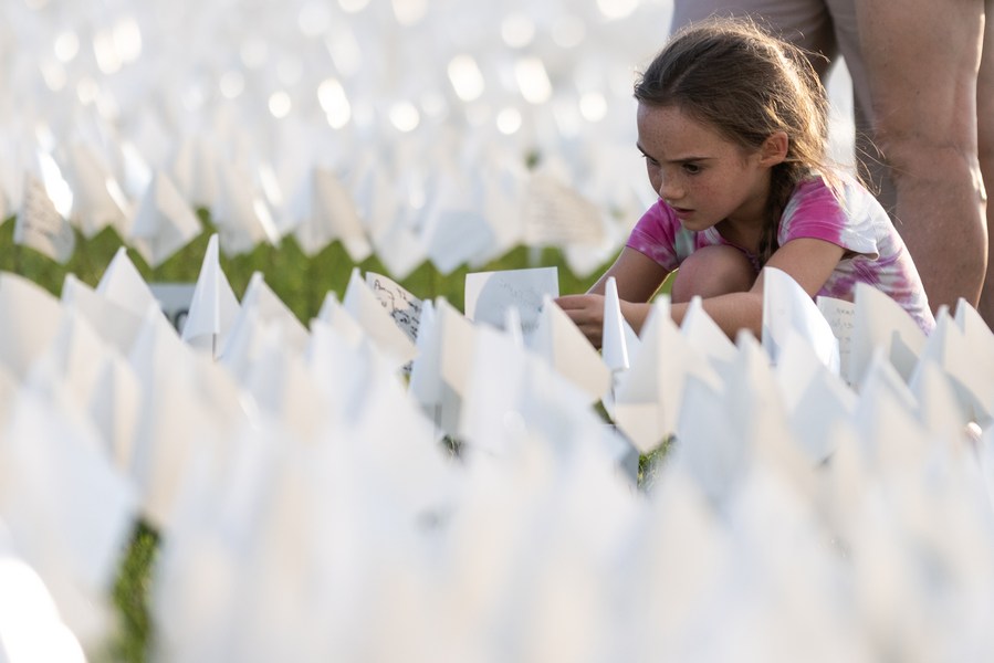A child places a white flag on the National Mall in Washington, D.C., the United States, Sept. 18, 2021. More than 660,000 white flags were installed here to honor the lives lost to COVID-19 in the United States. (Photo by Aaron Schwartz/Xinhua)