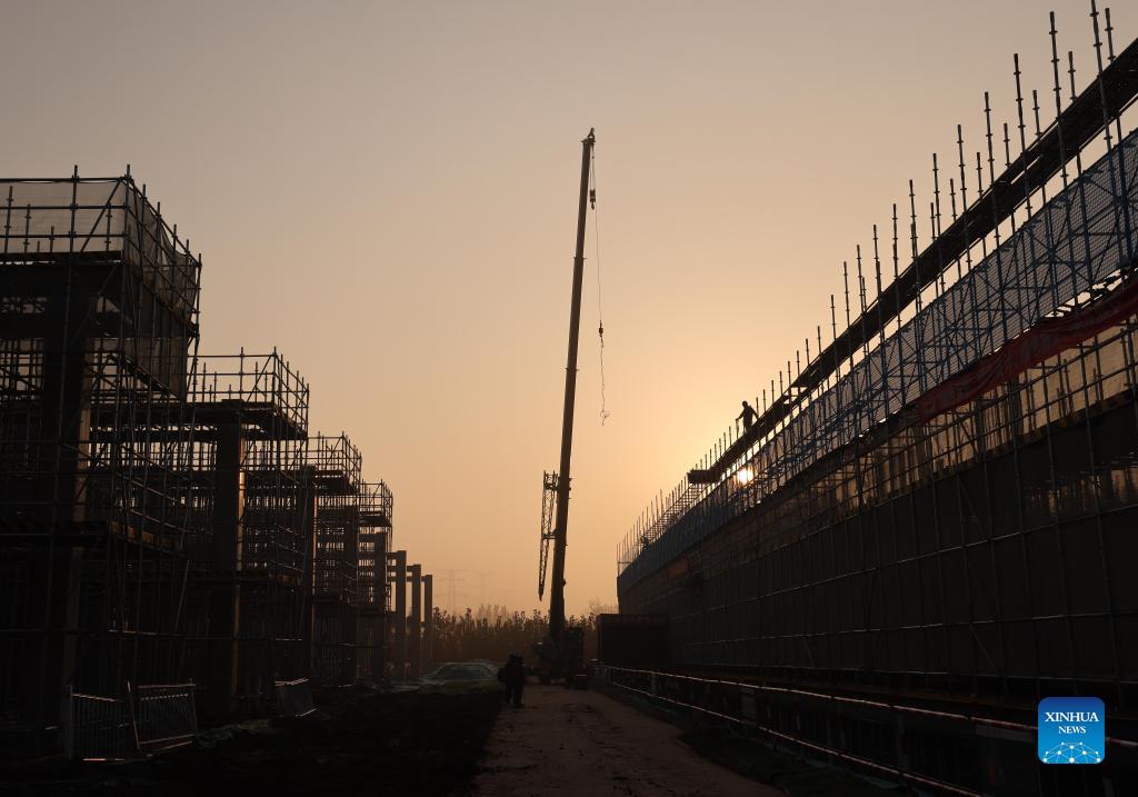 Workers work at a construction site of the 500-KV Xiongdong electricity substation in north China's Hebei Province, Sept. 29, 2021. Xiongdong substation, the first 500-KV substation of Xiongan New Area, is scheduled to be put into operation in 2022, with a total investment of 460 million yuan (about 71.14 million U.S. dollars). (Xinhua/Xing Guangli)