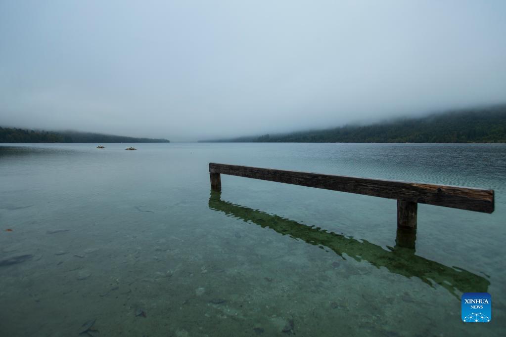 Photo taken on Sept. 28, 2021 shows the Lake Bohinj at dawn in Triglav National Park, Slovenia. (Photo by Zeljko Stevanic/Xinhua)