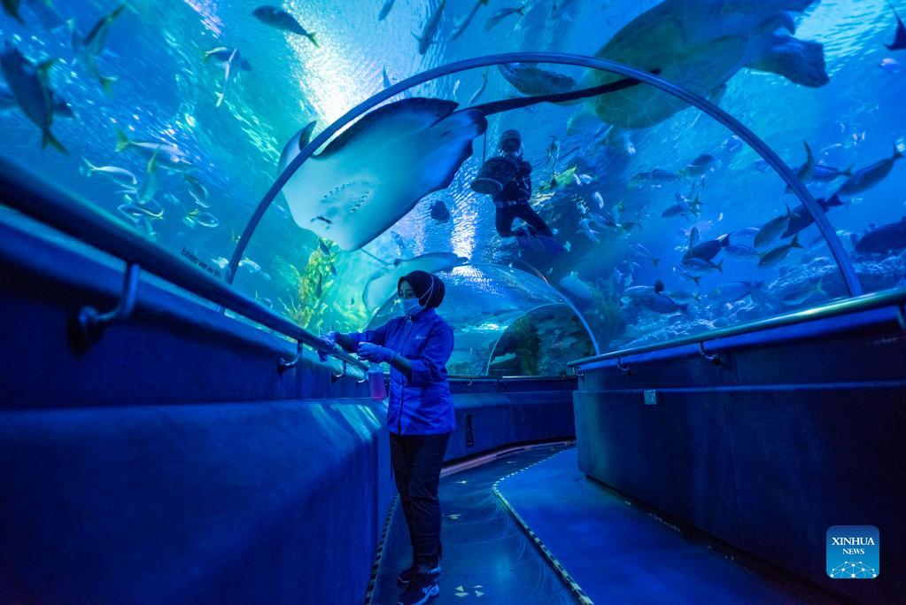 A staff member prepares for the reopening at Aquaria KLCC in Kuala Lumpur, Malaysia, Sept. 29, 2021. Aquaria KLCC will be open for fully vaccinated visitors starting from Oct. 1. (Photo by Chong Voon Chung/Xinhua)