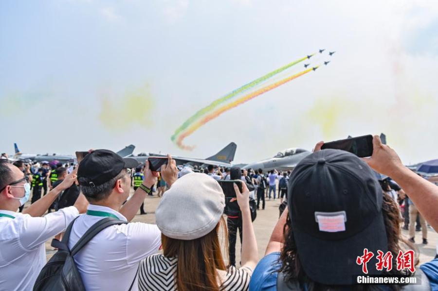 Members of teenage team from Hong Kong and Macao take shots of aerobatic stunts performed by The Bayi (August 1st) Aerobatics Team of the PLA Air Force, Sept. 29, 2021. (China News Service/Chen Jimin)