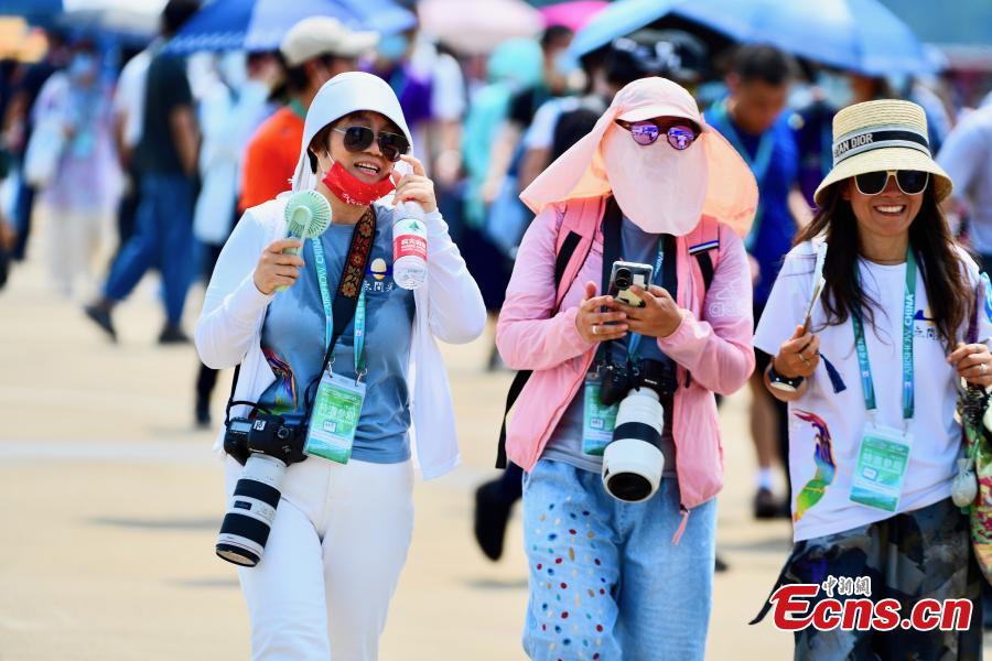 Spectators snap shots of air performances during the 13th China International Aviation and Aerospace Exhibition in the southern Chinese city of Zhuhai, Guangdong Province, Sept. 29, 2021. (China News Service/Chen Wen)