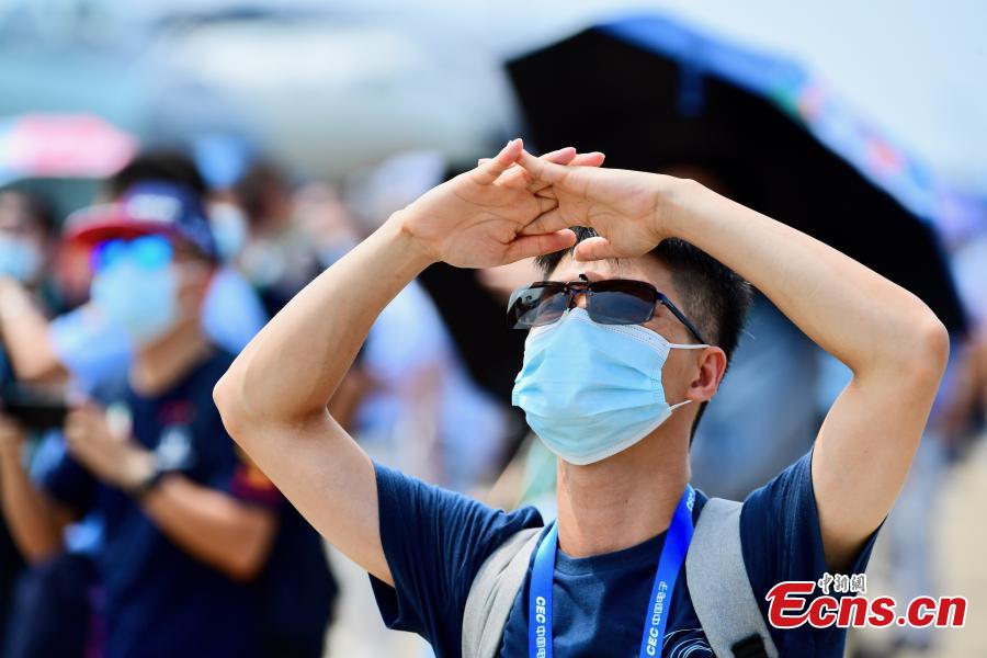 A spectator focuses on the air performances during the 13th China International Aviation and Aerospace Exhibition in the southern Chinese city of Zhuhai, Guangdong Province, Sept. 29, 2021. (China News Service/Chen Wen)