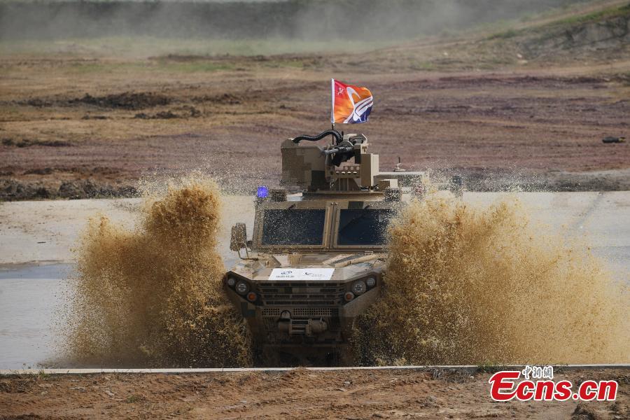 The ground equipment presents dynamic demonstrations during the 13th China International Aviation and Aerospace Exhibition in the southern Chinese city of Zhuhai, Guangdong Province, Sept. 29, 2021. (China News Service/Chen Chuhong)
