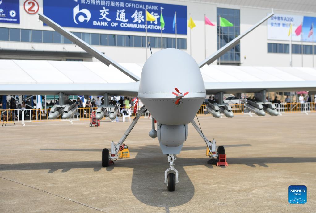 Photo taken on Sept. 28, 2021 shows an unmanned aerial vehicle (UAV) for assault purpose displayed at the 13th China International Aviation and Aerospace Exhibition, or Airshow China 2021, in Zhuhai, south China's Guangdong Province. (Xinhua/Deng Hua)