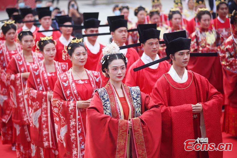 Newlyweds dressed in traditional Han costumes (Hanfu) attend a group wedding ceremony at a historical and cultural park in Xuzhou City, east China's Jiangsu Province, Sept. 29, 2021. (China News Service/Yang Bo)