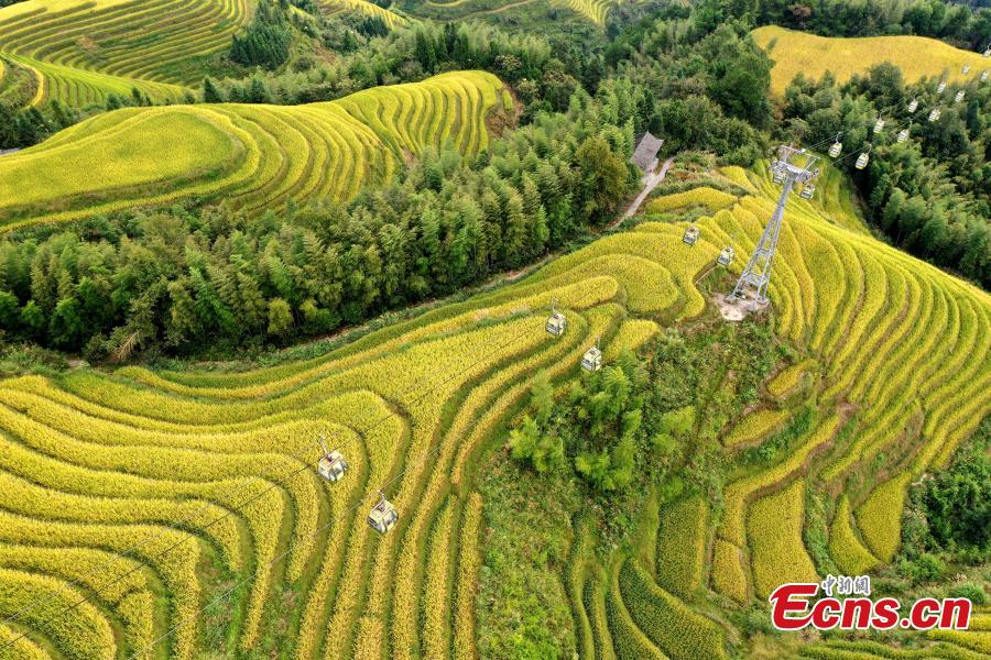 Photo taken on Sept. 29, 2021 shows the breathtaking autumn scenery of the Longji terraced fields blanketed by golden rice paddies in Longsheng County, south China’s Guangxi Zhuang Autonomous Region. (China News Service/Yu Jing)