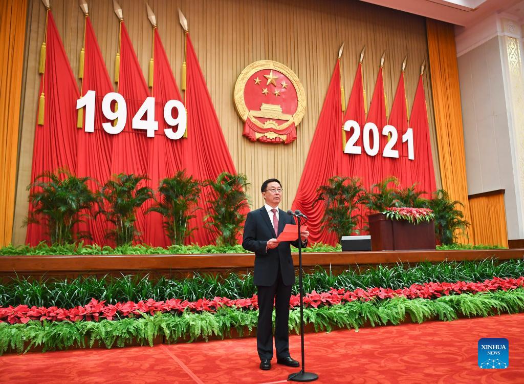 Chinese Vice Premier Han Zheng, also a member of the Standing Committee of the Political Bureau of the Communist Party of China Central Committee, presides over a reception held by the State Council to celebrate the 72nd anniversary of the founding of the People's Republic of China at the Great Hall of the People in Beijing, capital of China, Sept. 30, 2021. (Xinhua/Xie Huanchi)