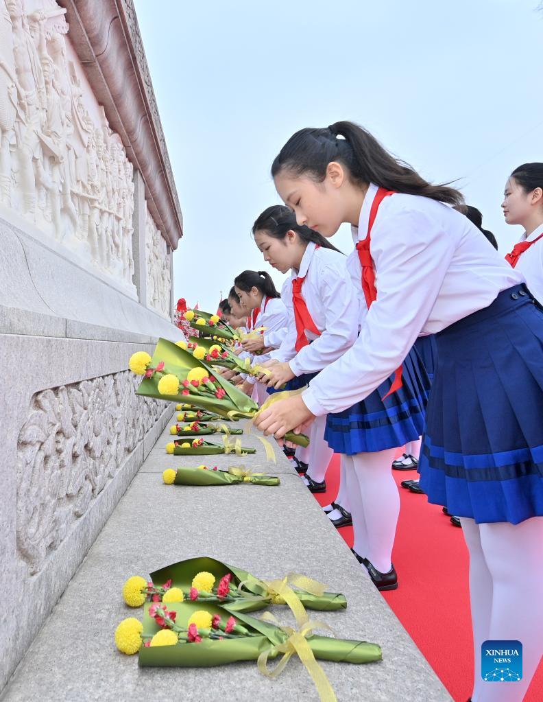 A ceremony offering floral tribute to fallen national heroes is held at Tian'anmen Square to mark the Martyrs' Day in Beijing, capital of China, Sept. 30, 2021. (Xinhua/Yue Yuewei)