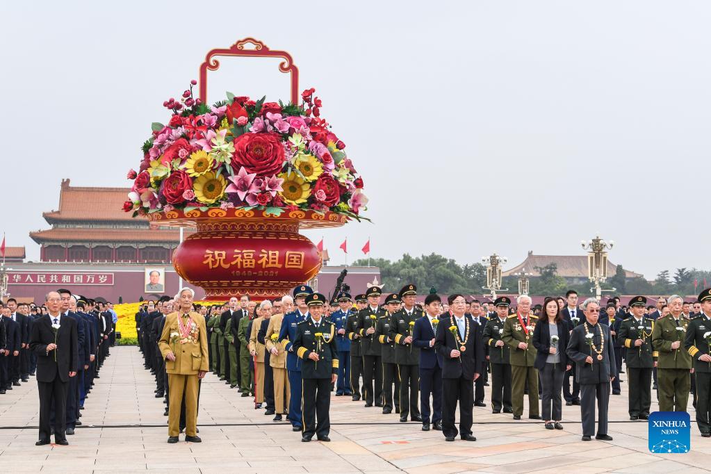 A ceremony offering floral tribute to fallen national heroes is held at Tian'anmen Square to mark the Martyrs' Day in Beijing, capital of China, Sept. 30, 2021. (Xinhua/Rao Aimin)