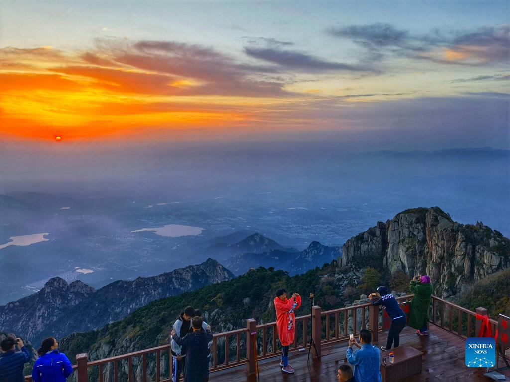 Photo taken with a mobile phone on Oct. 1, 2021 shows the scenery of sunrise on Taishan Mountain in Tai'an City, east China's Shandong Province. (Photo by Jiang Dongtao/Xinhua)