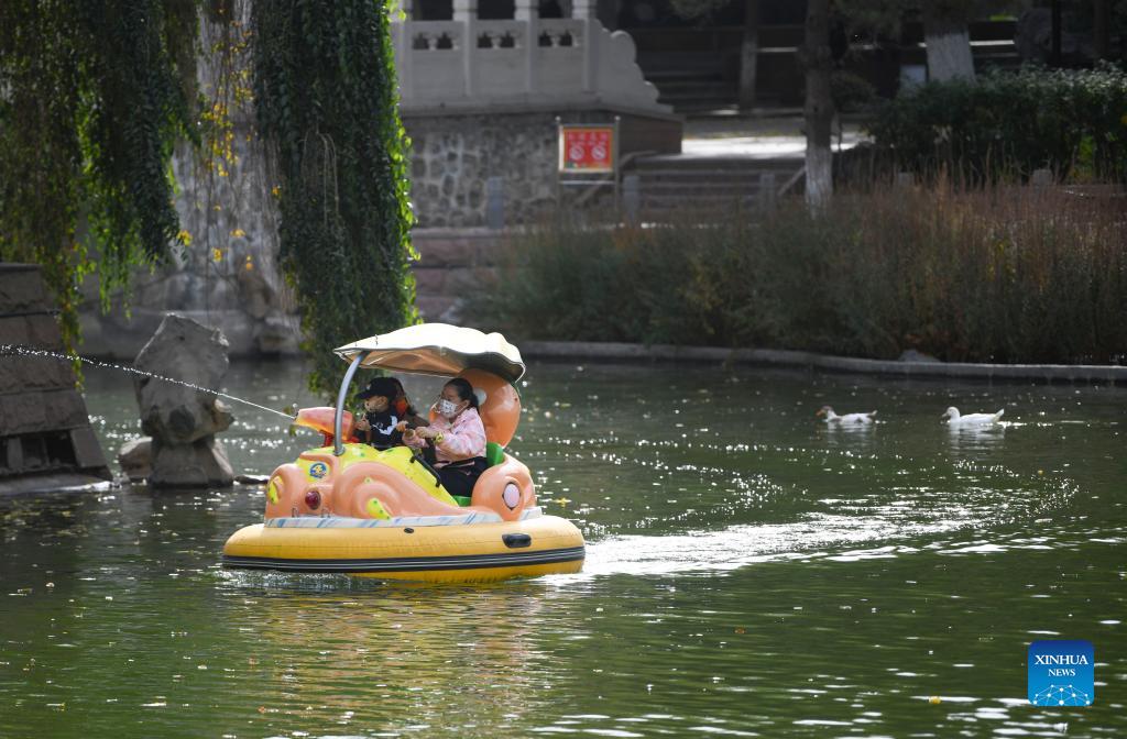 Citizens take a boat on the lake at the Renmin Park in Urumqi, northwest China's Xinjiang Uygur Autonomous Region, Oct. 1, 2021. (Xinhua/Zhao Ge)