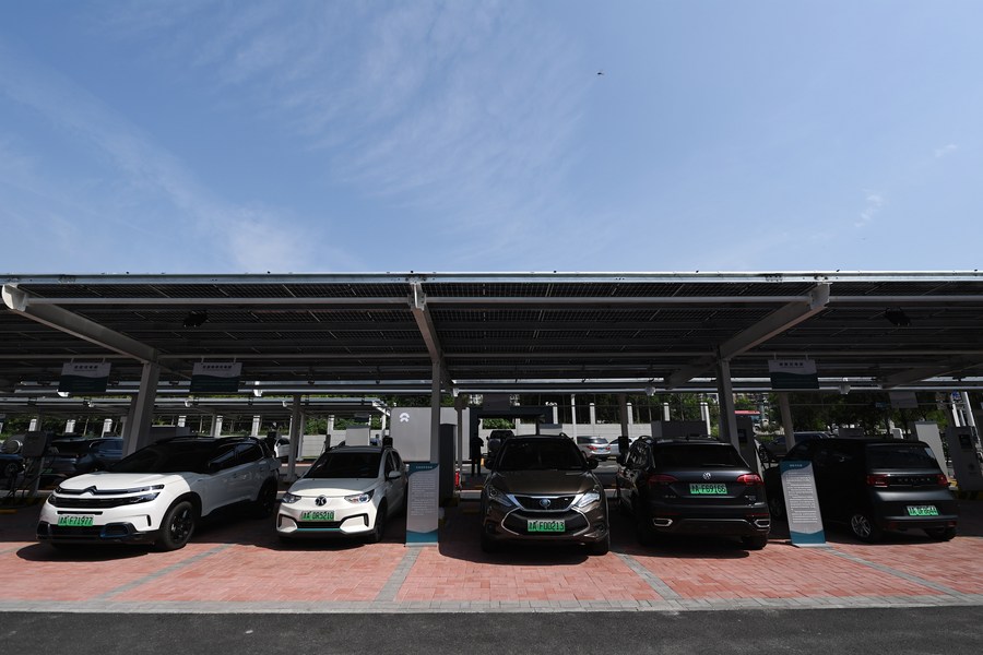 New energy vehicles are charged at the Jinmenhu New Energy Vehicle Integrated Service Center in north China's Tianjin, Aug. 18, 2021. (Xinhua/Li Ran)