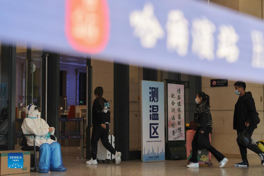 An epidemic prevention worker is seen on duty at the entrance of Harbin Railway Station in Harbin, northeast China's Heilongjiang Province, Oct. 2, 2021. Strict epidemic prevention and control measures have been imposed at the city's main shopping malls, tourist attractions and other sites where mass gatherings take place during the ongoing National Day holiday. Many essential workers stick to their posts to conduct temperature checks, health code checks, and disinfection. (Xinhua/Zhang Tao)