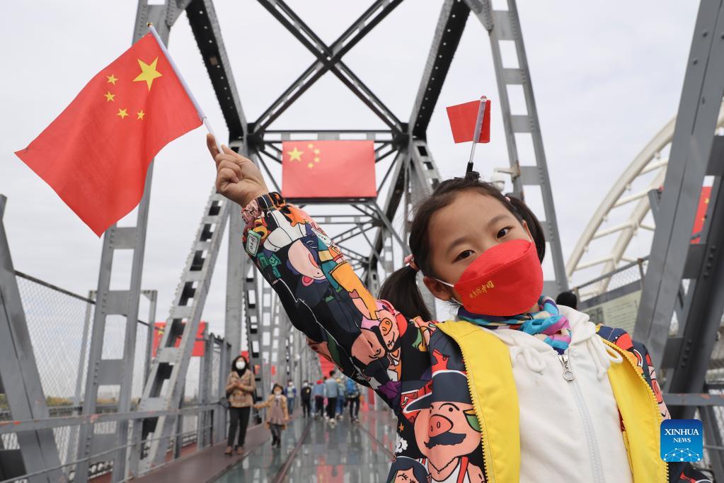 A child waves the Chinese national flag while posing for photos on a bridge in Harbin, northeast China's Heilongjiang Province, Oct. 2, 2021. Strict epidemic prevention and control measures have been imposed at the city's main shopping malls, tourist attractions and other sites where mass gatherings take place during the ongoing National Day holiday. Many essential workers stick to their posts to conduct temperature checks, health code checks, and disinfection. (Xinhua/Zhang Tao)